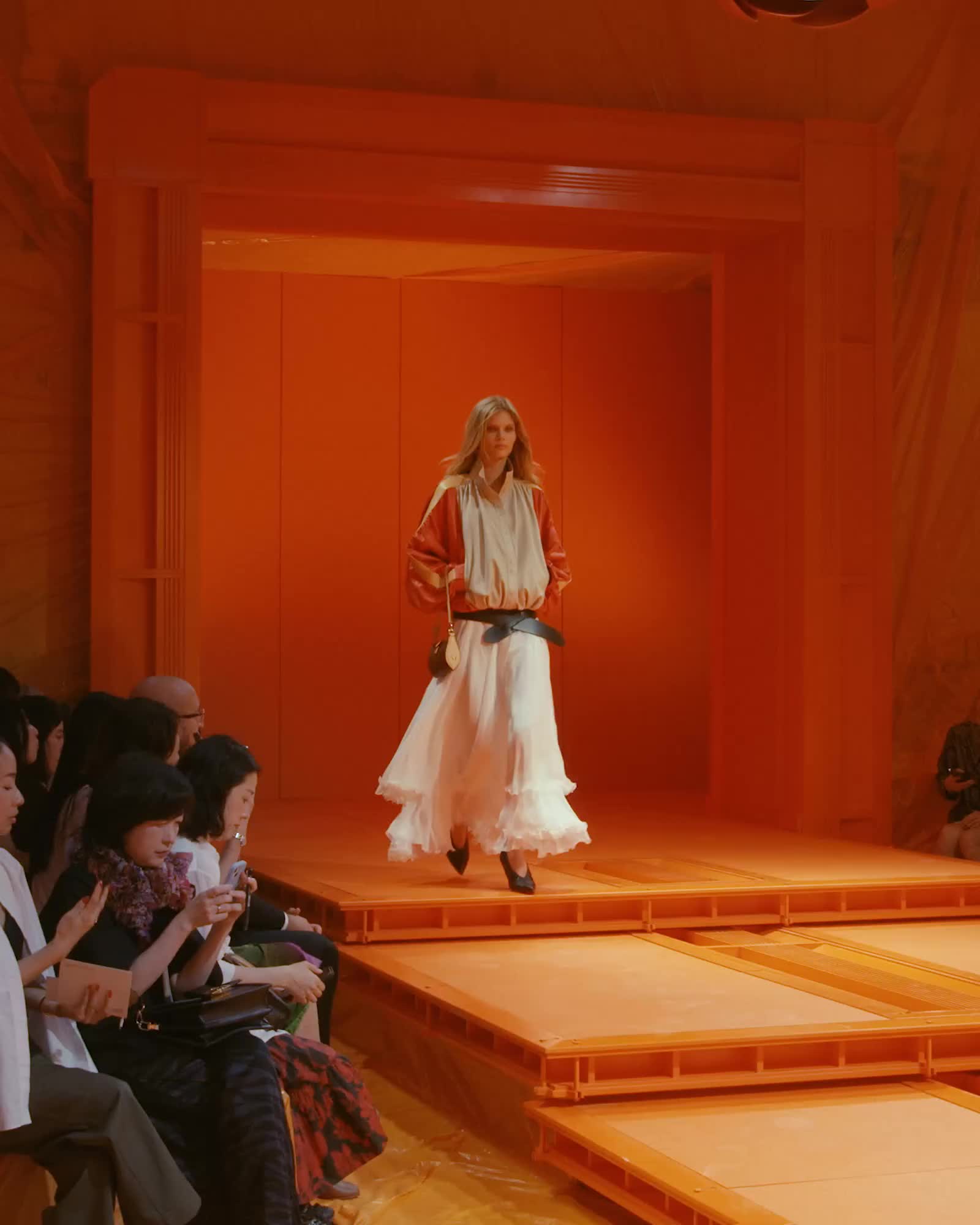 Kreasi menawan ini memadukan mode klasik ala Paris dengan gaya busana vintage, dihiasi dengan garis-garis grafis dan corak yang canggih. Nicolas Ghesquière bermain dengan lapiran bervolume untuk menciptakan siluet ringan dan ansambel yang dirancang khusus, masing-masing mencakup aspek feminitas yang berbeda, disempurnakan dengan hiasan kreasi ikat pinggang atau aksesori dari bahan rhinestone untuk tampilan yang berani.