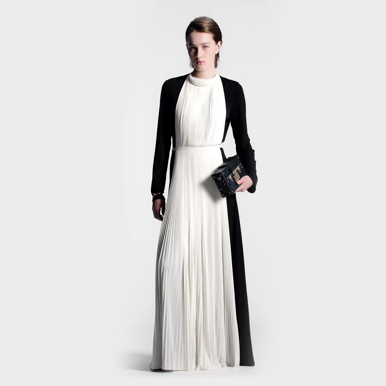 Terbuat dari bahan viscose jersey ringan, dress berlengan panjang ini tampil anggun dengan desain memanjang hingga lantai dan bagian punggung yang terbuka. Detail plisket yang kontras memberi sentuhan tekstur yang elegan sekaligus memperlihatkan kepiawaian Rumah Mode. Sementara model leher bergulung menghadirkan efek ilusif menyerupai bentuk perhiasan.