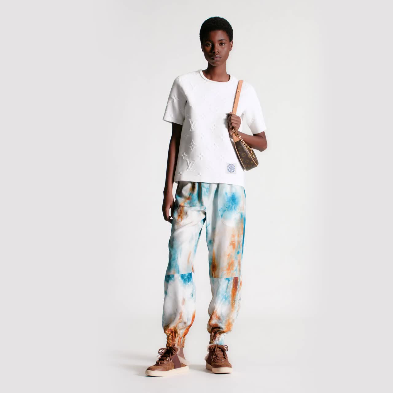 Jogging pants ini tampil dalam nuansa cerah khas musim panas. Bahan silk toile yang ringan dan fleksibel diberi finishing tie-dye warna-warni, lengkap dengan aksen Monogram untuk sentuhan Rumah Mode yang ikonis. Dapat dikenakan oleh pria dan wanita, celana ini disempurnakan detail lipatan pada bagian pergelangan kaki serta tali serut elastis di bagian pinggang.