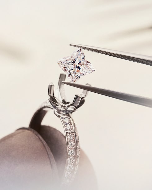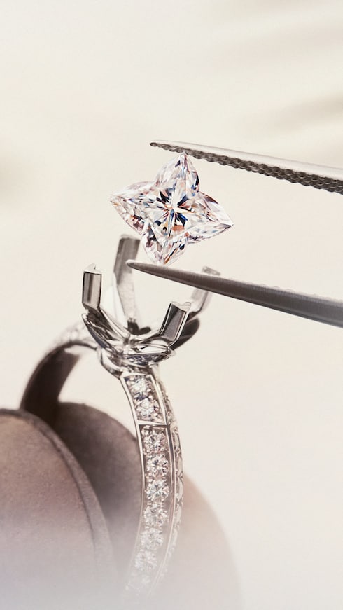 Ogni pietra centrale è posizionata a mano da artigiani in Francia o in Italia, che danno vita ad ogni creazione LV Diamonds grazie ad incastonature raffinate e ricche di dettagli, con delicate griffe a V o castoni a forma di fiore.