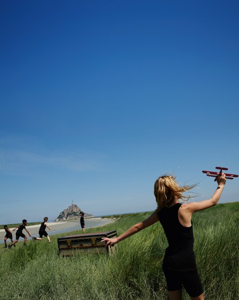 Sullo sfondo monumentale del Mont Saint-Michel, in Francia, un gruppo di bambini nativi del luogo si avventura sul litorale dell'isola, incarnando un senso di ottimismo e libertà senza limiti.