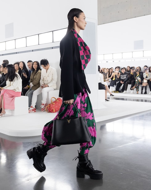 La collezione, che celebra l'armonia ispiratrice posta tra due mondi singolari, offre una prospettiva rinnovata ai codici di Louis Vuitton. Le silhouette classiche sono rivisitate in un vivace cromatismo, punteggiato da dettagli emblematici e da una serie di borse e accessori reinterpretati.