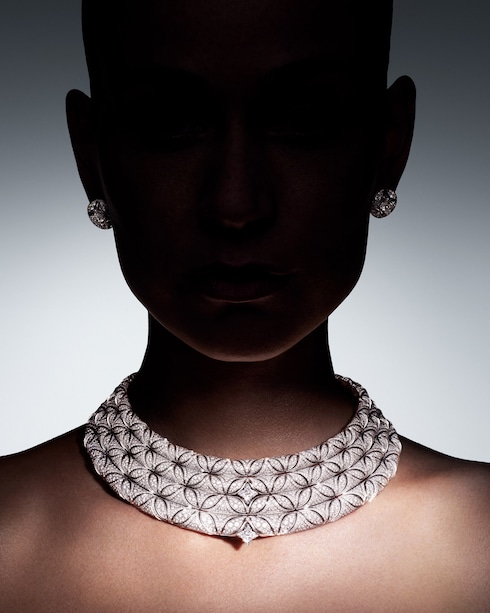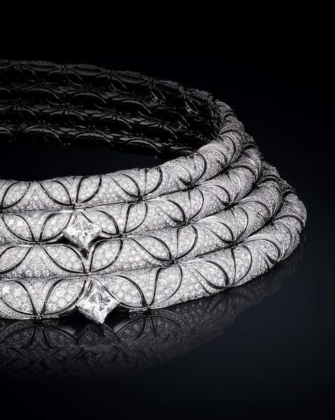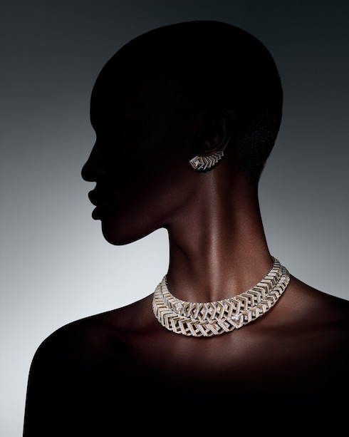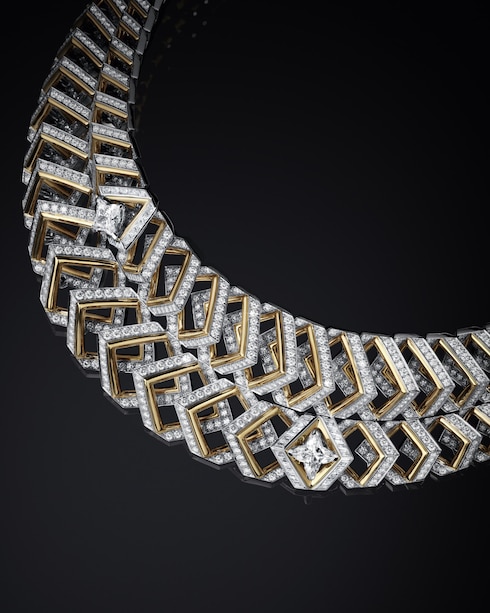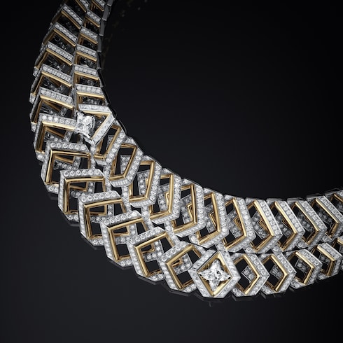 Dynamisme richiama il moderno collettivismo dell'epoca, evocando il fenomeno del viaggio che ha spinto Louis Vuitton all'avanguardia dell'innovazione. La collana, altamente strutturata, crea un'immagine grafica di interconnessione grazie alle maglie allineate con precisione e ai diamanti LV Monogram Star cut, sottolineando la maestria tecnica attraverso il motivo a chevron 3D a due fili, mentre il platino e l'oro giallo ne esaltano la direzionalità angolare.