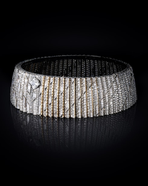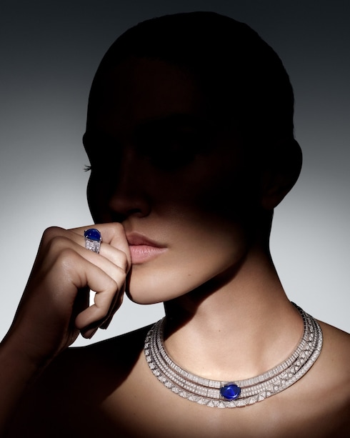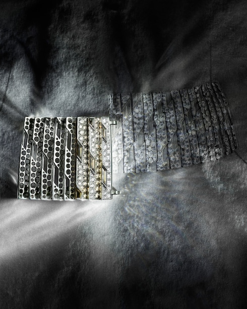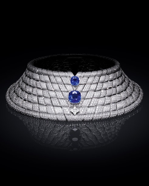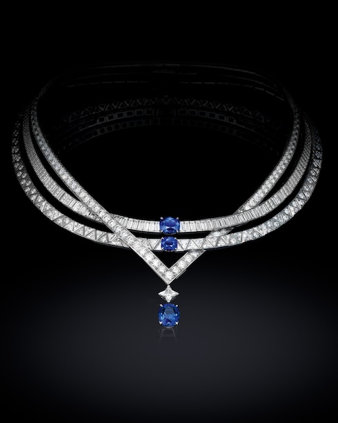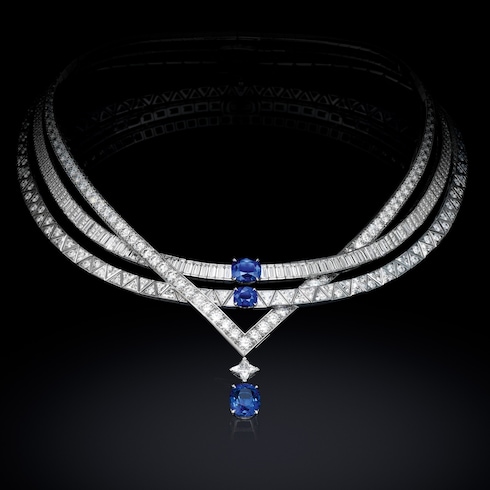 Perception illustra l'idea di movimento e il nuovo ritmo dell'epoca attraverso una ripetizione di motivi geometrici composti da una miriade di diamanti. Due incomparabili zaffiri illuminano questo capolavoro con il loro scintillio blu vellutato.