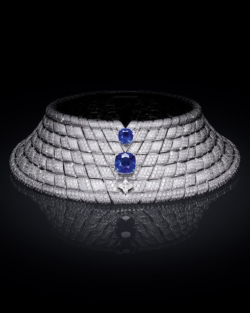 Ispirata allo spirito del viaggio di Louis Vuitton, Vision richiama l'espansione delle ferrovie e il nuovo senso di libertà e di scoperta che queste hanno risvegliato. Le maglie intrecciate a forma di V sono impreziosite da rivetti luminosi che rimandano ai codici della fabbricazione di bauli della Maison, svelando un collier avvolgente, esaltato da splendidi zaffiri gialli.
