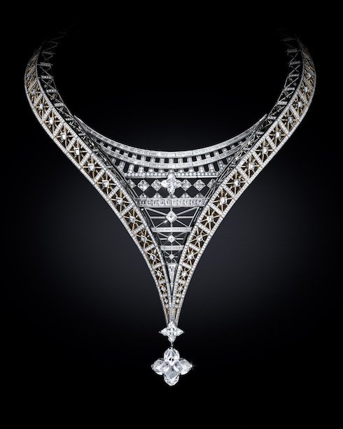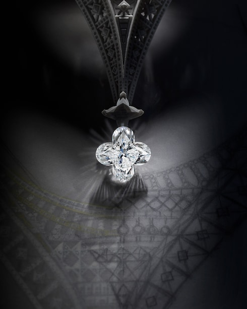 Omaggio all'iconico monumento francese, Victoire celebra la Torre Eiffel attraverso una singolare prospettiva invertita, tramite una splendida collana a forma di V. Un diamante D IF LV Monogram Flower da 15,16 carati impreziosisce il gioiello.