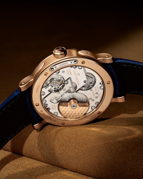 Ricco di complessità, il quadrante rivela indici e borchie in oro ispirati agli accenti metallici e ai chiodi a losanga delle emblematiche valigie Louis Vuitton, mentre il centro con finitura granulata aggiunge texture visiva alle varianti in oro rosa, in un omaggio all'iconica tela Monogram della Maison.