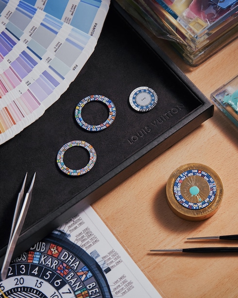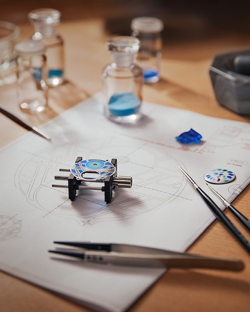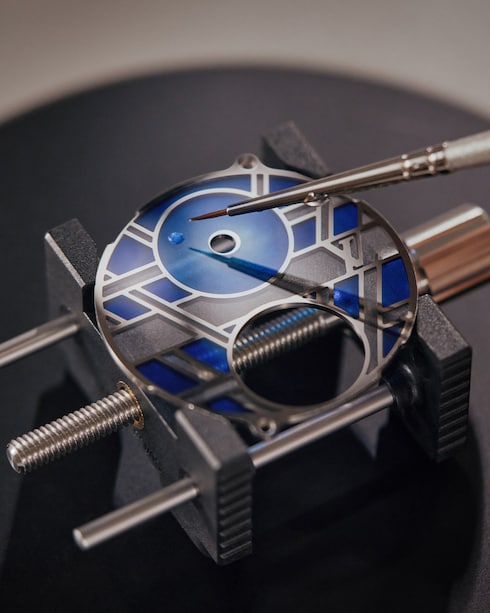 Espressione dell'incontro tra gli smalti e il calore per rivelare la brillantezza e l'intensità dei colori, la smaltatura è un'arte rigorosa che richiede competenze tecniche di alto livello, acquisite nel corso di diversi anni dai maestri smaltatori de La Fabrique du Temps Louis Vuitton. Tra queste, la plique-à-jour, con il suo gioco di trasparenze e contrasti, evidenziato da una struttura cloisonné in oro, e la paillonné, che esalta gli strati di smalto con sottili frammenti di foglia d'oro.