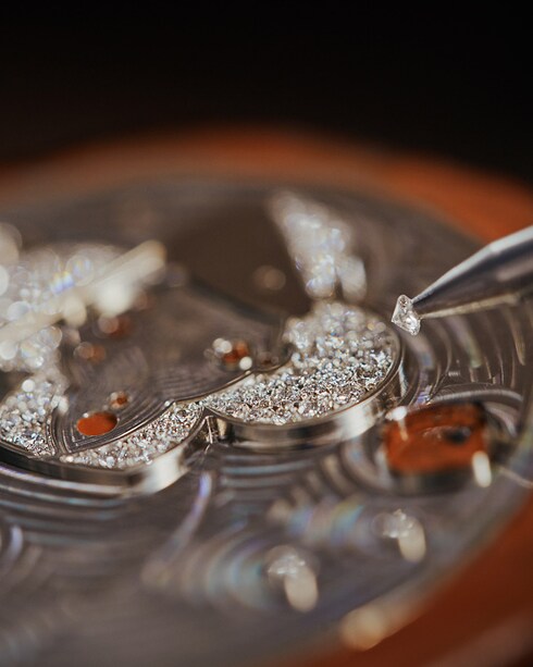 L'incastonatura delle gemme aggiunge un tocco di preziosità alle creazioni della Manifattura, conferendo un fascino radioso a lunette, casse e quadranti. Il metallo viene prima finemente lavorato dal maestro gioielliere per adattarsi alle pietre, incastonate dal maestro incastonatore con cura impareggiabile ed estro artistico, utilizzando metodi raffinati come l'incastonatura chiusa, a griffe o a neve, la cui finitura poetica evoca fiocchi volteggianti.