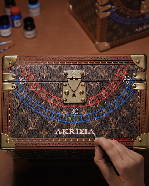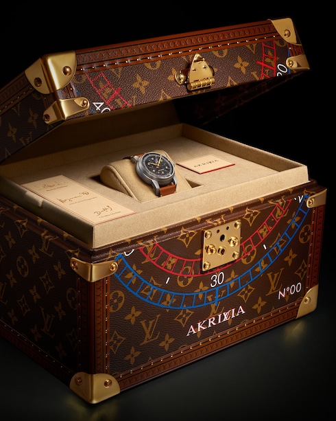 In omaggio allo spirito di viaggio Louis Vuitton, l'orologio LVRR-01 è custodito in un esclusivo baule dipinto a mano. Ogni baule è decorato con un motivo ispirato al cronografo sul quadrante in smalto grand feu adiacente al logo “AKRILVIA” ed è dotato di un numero di serie unico.