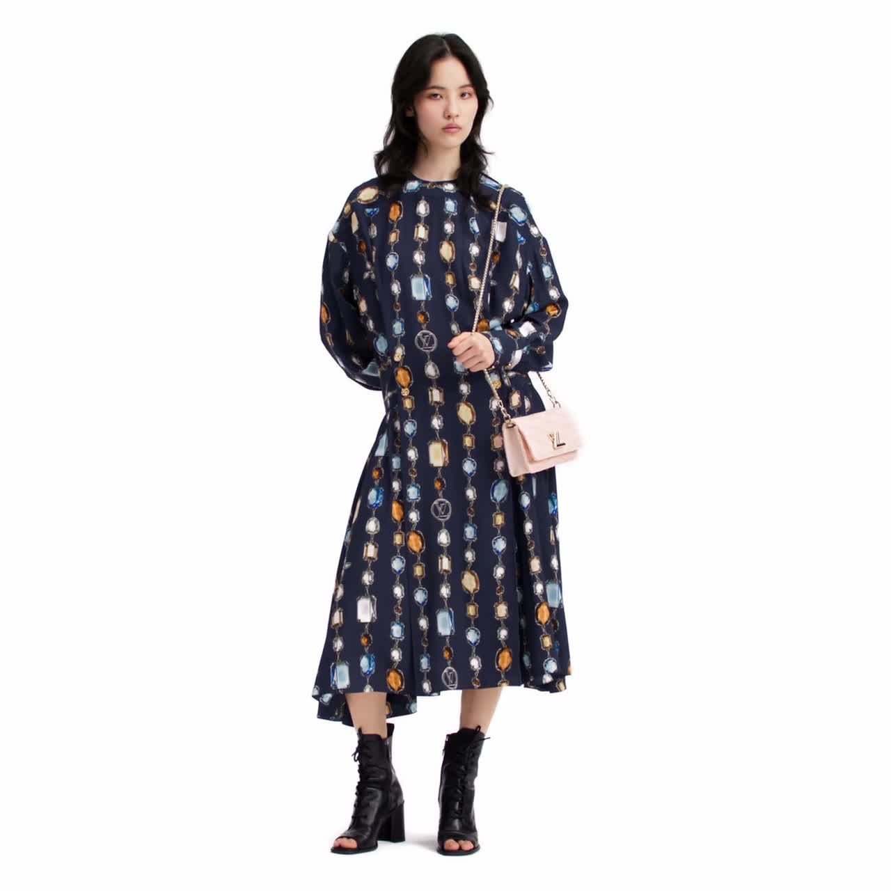 L'abito a maniche lunghe, realizzato in seta crêpe de chine fluente, presenta un'elegante silhouette caratterizzata dal punto vita definito e dalla gonna a mezza lunghezza. Il capo è impreziosito da una stampa oversize dell'originale motivo di collana distintivo della stagione, che combina dettagli emblematici e pietre preziose. I polsini sono decorati da bottoni dorati con finitura martellata.