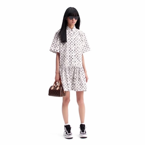 L'abito-camicia, realizzato in popeline di cotone, si distingue per l'audace motivo Monogram stampato all-over, rivisitato in stile Pop Art. La parte superiore del capo presenta un classico design sartoriale a maniche corte, con colletto e abbottonatura anteriore. La gonna è caratterizzata dalle arricciature sui fianchi, che donano alla creazione estiva un tocco di volume.