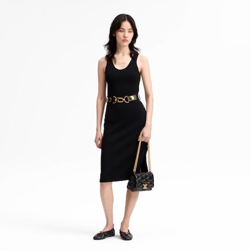 L'abito è realizzato in jersey di crêpe misto viscosa leggero. Il raffinato modello si caratterizza per l'elegante silhouette al ginocchio, messa in risalto da dettagli distintivi. Il capo è impreziosito in vita da una cintura in pelle con borchie dorate e un moschettone oversize, che dona un tocco di stile contemporaneo.