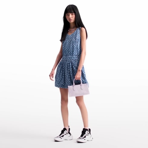 L'abito in denim leggero, perfetto per i look di tutti i giorni, è impreziosito da una stampa all-over dell'iconico motivo Monogram. Le impunture di colore giallo creano un effetto strutturato intorno al busto, mentre le arricciature in vita formano una voluminosa gonna a palloncino. La chiusura con zip a vista sul retro dona un tocco sportivo dall'allure contemporanea.