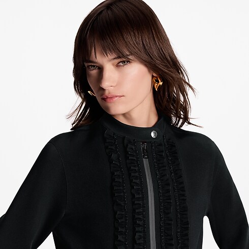 Questo abito, realizzato nell'iconico jersey tecnico della Maison, presenta un'estetica pulita e contemporanea. Il taglio valorizza l'elegante silhouette a maniche lunghe e la vita delicatamente affusolata. Il colletto con bottoni a pressione e la zip rivestita sullo scollo donano un tocco sportivo, sapientemente bilanciato dalle finiture romantiche con ruches sul petto e sui polsini.