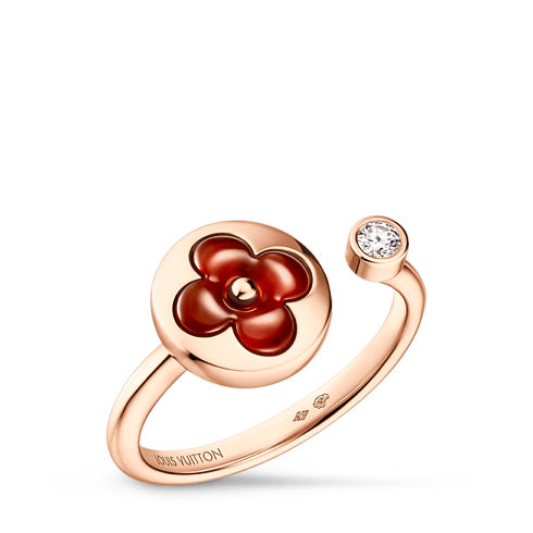L'anello Color Blossom Mini Sun, in oro rosa 18 carati, corniola e diamante, rende omaggio ai fiori Monogram, creati nel 1896 da Georges Vuitton, figlio del fondatore della Maison. Il prezioso accessorio si distingue per il brillante rotondo e per l'iconico motivo a sole incastonato, che sboccia nella preziosa pietra rossa intagliata e lucidata a mano, frutto di mesi di lavoro artigianale, che ne rifinisce le raffinate curve e gli scintillanti riflessi. L'emblematico gioiello può essere indossato da solo o abbinato ad altre creazioni della collezione.