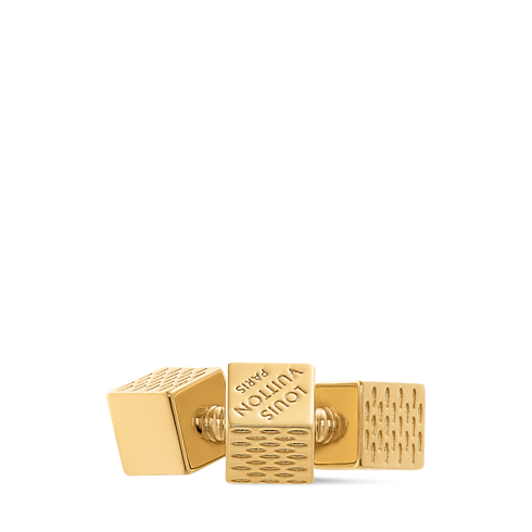 Le forme angolari di Pateki, rompicapo ideato da Gaston Vuitton nel 1932, prendono vita nell'anello LV Cube, accessorio ironico ed elegante. Tre cubi in metallo dorato sono delicatamente incisi con linee che richiamano l'iconico motivo della tela Damier. La firma Louis Vuitton Paris aggiunge un raffinato richiamo alla Maison a questo incantevole modello, realizzato con grande maestria artigianale.