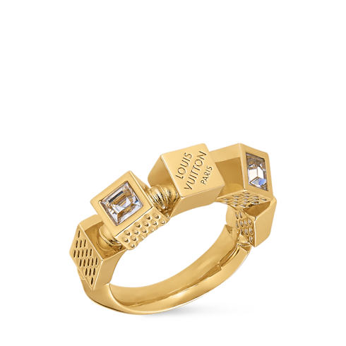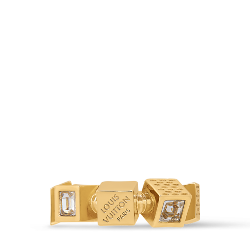 Le forme angolari che catturano lo sguardo dell'anello LV Cube si ispirano a Pateki, rompicapo inventato da Gaston Vuitton nel 1932. La fascia in metallo dorato accoglie una serie di cubi incisi con sottili righe, a richiamare il motivo della storica tela Damier, che sono ulteriormente impreziositi dalla firma Louis Vuitton Paris. Strass scintillanti donano un tocco di luce raffinata a questo incantevole modello.