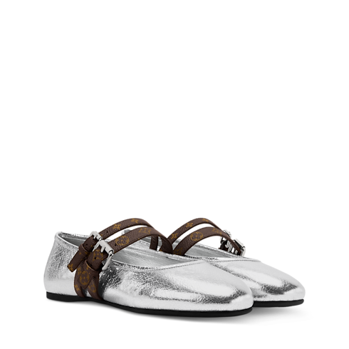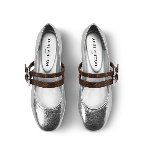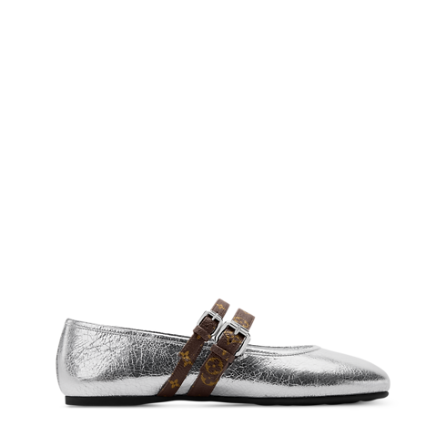 Questa versione della ballerina Mary Jane Bella esalta il contrasto tra la tomaia in pelle di vitello metallizzata effetto craquelé e i due cinturini nell'iconica tela Monogram, elemento distintivo di questa décolleté dal carattere contemporaneo. I due dettagli presentano infatti larghezze diverse e sono entrambi impreziositi da fibbie color argento. Una morbida suola in gomma completa il modello.