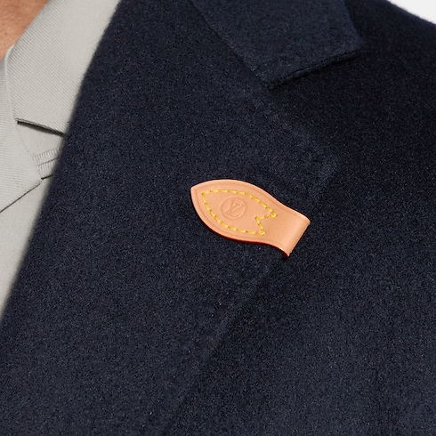 - Dettaglio iconico in vacchetta naturale sul rever sinistro