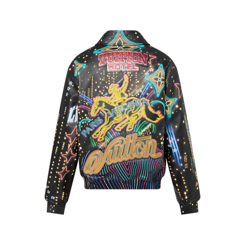 Il bomber, presentato in occasione della sfilata Autunno-Inverno 2024, si distingue per il sofisticato motivo Vuitton Motel, ispirato alle caratteristiche insegne illuminate al neon delle città americane. L'originale modello in pelle è impreziosito da lussuosi cristalli e applicazioni impresse, che rievocano le iconiche firme di Louis Vuitton. L'esclusivo capo, realizzato su ordinazione, incarna perfettamente lo spirito creativo della Maison.