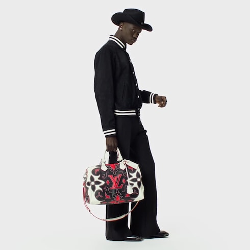 Il bomber è realizzato in pelle scamosciata nera, con bottoni a pressione effetto perlato che donano un tocco raffinato. Il modello si distingue per un'applicazione con fiore Monogram impreziosito da cristalli che decora il petto e un'altra con firma "Marque L. Vuitton déposée" sul retro. Il capo è completato dal colletto e dal fondo a coste con motivo a righe.