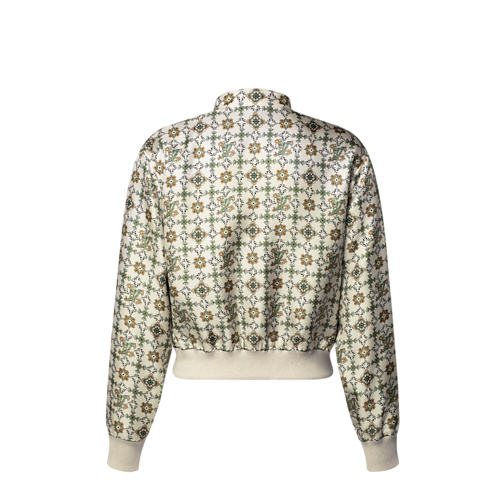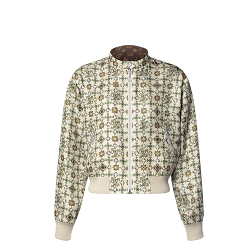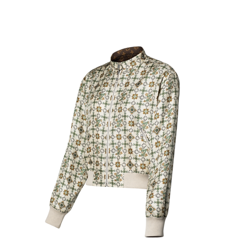 Un lato del bomber rende omaggio alle radici Art Nouveau della Maison con un raffinato motivo floreale all-over, impreziosito da eleganti dettagli iconici Louis Vuitton. L'altro lato presenta un classico motivo Monogram in trama jacquard, valorizzato da sofisticati dettagli in lana a contrasto. Realizzato in morbido twill di seta, è completato da una chiusura con zip e da un colletto con bottone a pressione per un tocco contemporaneo.