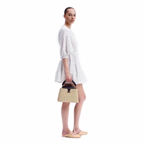 La borsa Capucines BB, realizzata in rattan, è un modello esclusivo la cui lavorazione artigianale richiede due giorni. L'originale creazione foderata si ispira ai bauli da picnic della Maison. L'accessorio, rifinito dalle iconiche iniziali LV, può essere portato posizionando la patta sia all'interno sia all'esterno, mentre le dimensioni sono ideali per contenere gli oggetti essenziali.