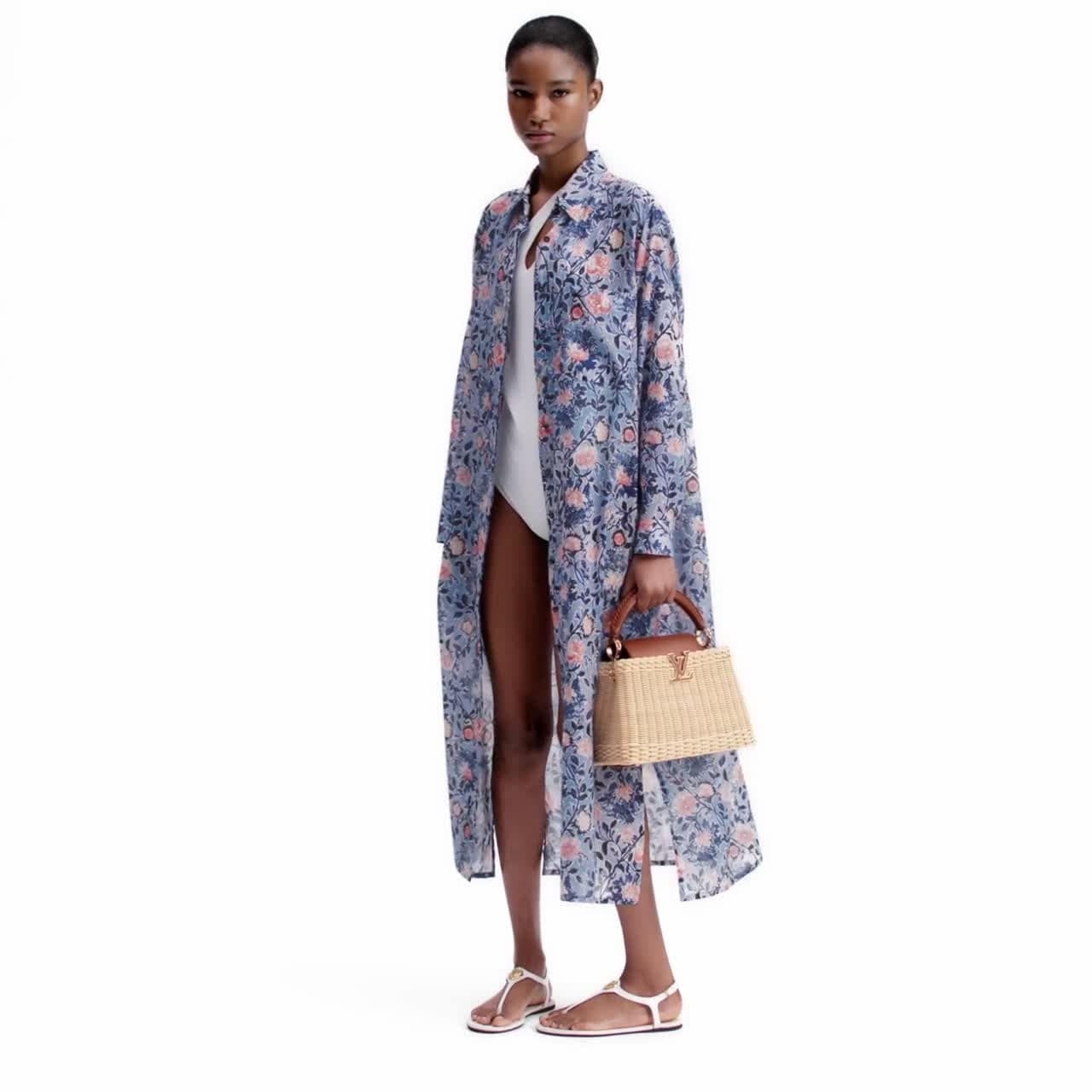 La borsa Capucines BB è realizzata in rattan intrecciato a mano e richiede due giorni di lavoro. L'elegante modello, dall'allure rilassata e ispirato al cestino da picnic della Maison del 1892, cela al suo interno un'accattivante fodera dalla fantasia esclusiva. La pratica creazione, dotata di patta che può essere ripiegata all'esterno o inserita, è completata dalle iconiche iniziali LV.