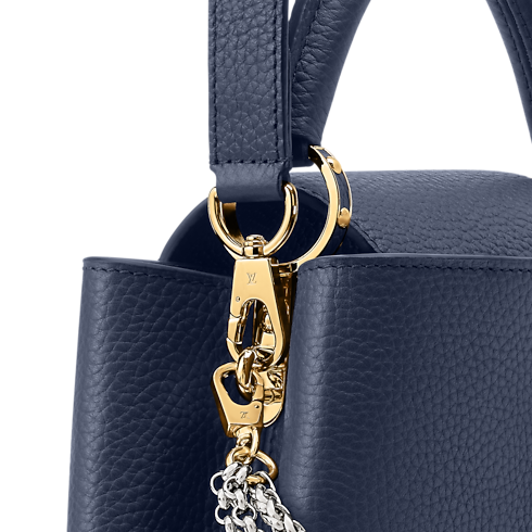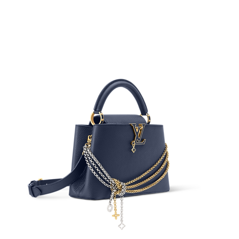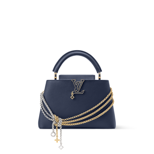 Parte della collezione Why Knot, la borsa Capucines BB viene reinterpretata in una raffinata tonalità Navy, che crea un elegante contrasto con le finiture in metallo misto. Realizzato in pregiata pelle Taurillon, il modello presenta una catenella decorativa e le iconiche iniziali LV tono su tono, omaggio al savoir-faire della Maison. Il modello double-carry offre uno spazio generoso, perfetto per custodire due smartphone: la scelta ideale per chi si muove in città.