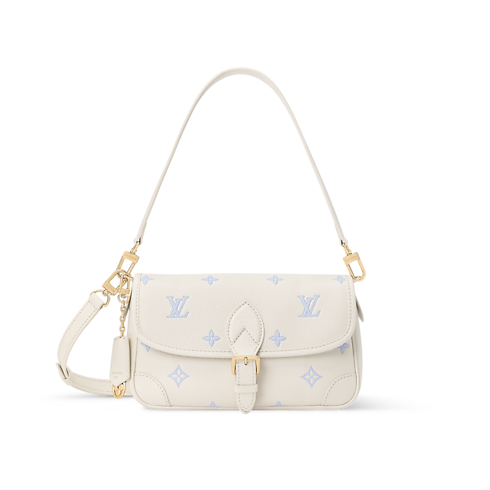 La borsa Diane viene reinterpretata in una raffinata palette bicolore nelle eleganti tonalità di bianco e blu della stagione. Questa versione contemporanea è realizzata in pelle Monogram Empreinte ed è impreziosita da parti metalliche color oro chiaro. Arricchita da un charm amovibile con iniziali LV, la creazione si apre per rivelare una tasca piatta con zip, ideale per custodire gli oggetti più piccoli.