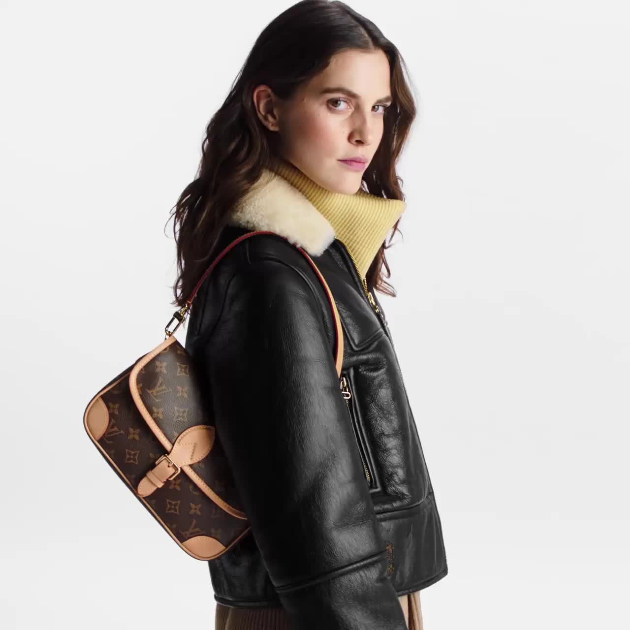La borsa Diane rivisita un iconico design degli anni Novanta in una versione in tela Monogram. Il modello messenger, dall'interno ben organizzato, è rifinito da eleganti dettagli vintage, come gli angoli in pelle e la fibbia ispirata agli archivi della Maison. L'ampia tracolla in trama jacquard è impreziosita dalla firma Louis Vuitton su un lato e dagli emblematici fiori sull'altro.