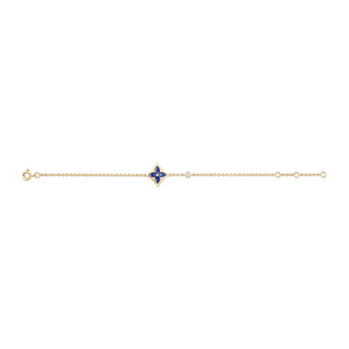 La linea Color Blossom rende omaggio ai fiori Monogram, creati nel 1896 da Georges Vuitton, figlio del fondatore della Maison. L'elegante bracciale si distingue per l'iconico motivo Star incastonato nell'oro giallo 18 carati (750/1000), che sboccia nella preziosa sodalite lucidata a mano. La catenella viene ulteriormente messa in evidenza da un diamante rotondo a taglio brillante. La lunga lavorazione artigianale permette di rifinire le delicate incurvature e lo splendore della pietra. L'emblematico gioiello è ideale da abbinare agli altri modelli della collezione.