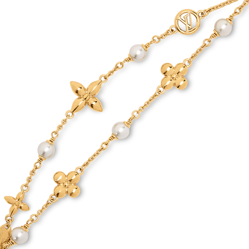 Il bracciale Pearl Constellations, ispirato alla magia di un cielo stellato, si caratterizza per l'allure sontuosa e celestiale al contempo. La creazione è impreziosita dai fiori Monogram in lucente metallo dorato che ricordano una costellazione, alternati a luminose perle in resina bianca. Il logo LV Circle aggiunge un ulteriore tocco distintivo all'accessorio, dallo stile raffinato e ultra-femminile.