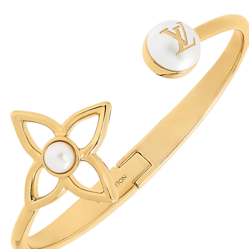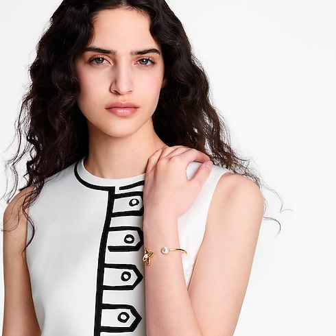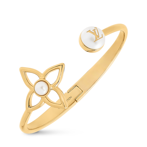 Il bracciale Pearly Flower unisce l'iconico emblema della Maison al simbolismo della perla, per un design sofisticato. Il modello, realizzato in metallo color oro, presenta un fiore Monogram con lavorazione a giorno e due perle in resina, di cui una impreziosita dalle iniziali LV per un ulteriore tocco distintivo. L'esclusiva creazione, perfetta per qualsiasi occasione, emana una raffinata femminilità.