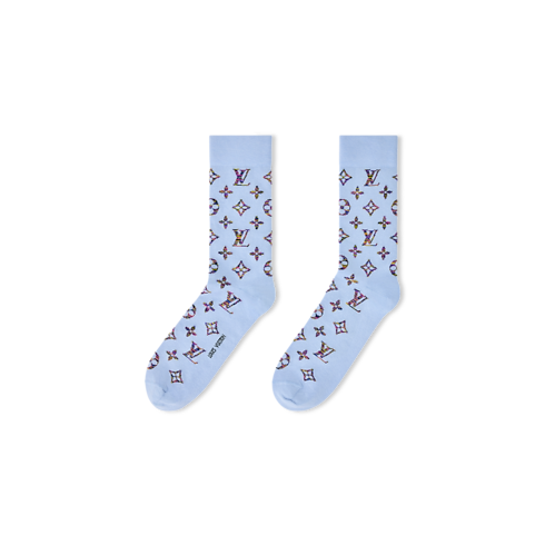 Caratterizzati dalla giocosa rivisitazione del motivo Monogram, questi calzini si distinguono per la loro vivace palette cromatica e la leggerezza del tessuto in misto cotone. Il motivo iconico della Maison è proposto in una combinazione di tonalità dinamiche, dal giallo al viola, ripetute dalla caviglia alla punta. Ogni accessorio è impreziosito dalla firma Louis Vuitton sotto la pianta del piede.