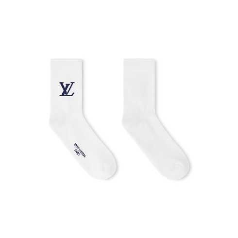 I calzini Only LV, realizzati in Italia, rivisitano un classico sportivo con un'allure elegante ed essenziale. Il modello, in misto cotone color bianco, è impreziosito appena sopra la caviglia dalle iniziali della Maison lavorate a maglia in una nuance blu intenso. Le creazioni sono ulteriormente arricchite dalla firma LOUIS VUITTON PARIS sul fondo.