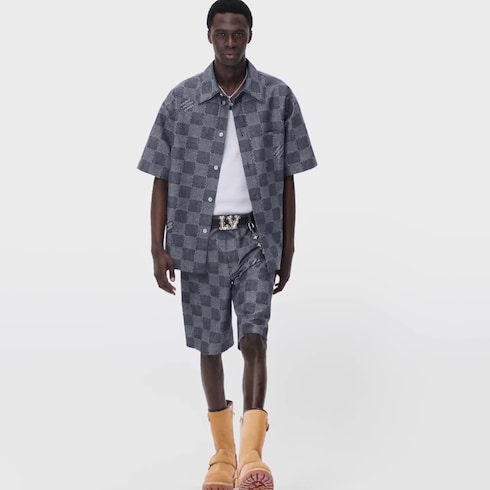 La camicia a maniche corte reinterpreta un classico dell'abbigliamento funzionale in chiave sofisticata. Il pregiato tessuto chambray è decorato dal motivo Damier in trama jacquard, con leggero effetto testurizzato e firme "Marque L. Vuitton déposée" incorporate, per un'originale nota grafica. Il modello, chiuso da eleganti bottoni madreperlati, può essere abbinato agli shorts coordinati per un raffinato outfit estivo.