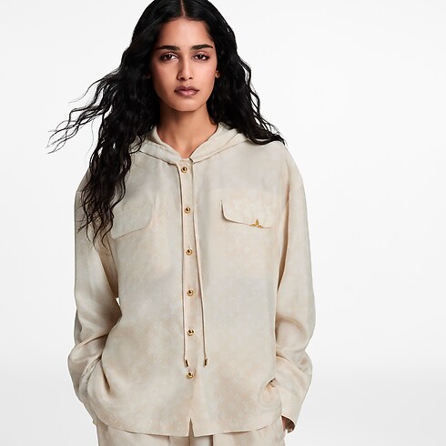Questa camicia è caratterizzata da una raffinata eleganza, con una silhouette pulita e squadrata, completata da un cappuccio casual con coulisse. Realizzato in seta fluida, il modello presenta un motivo Monogram Cloud dai delicati toni stagionali, mentre i dettagli in metallo dorato aggiungono un sofisticato dettaglio chic, incluso un fiore Monogram su una delle due tasche con patta.