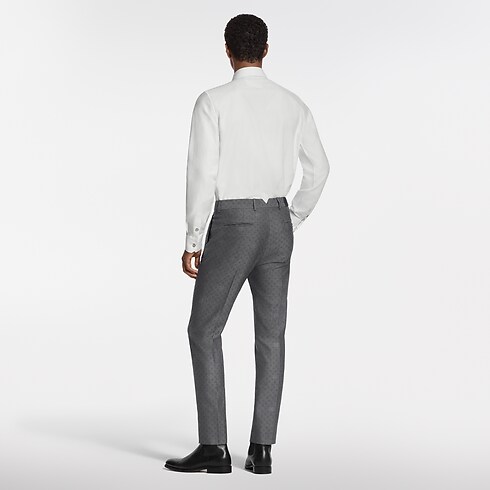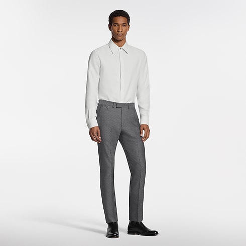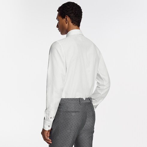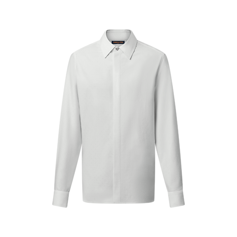 La raffinata camicia da sera color bianco è realizzata in pregiato cotone biologico. La silhouette minimalista con abbottonatura nascosta è impreziosita dal motivo Monogram Mini Spaced in jacquard tono su tono. Un bottone con iniziali LV chiude il colletto, mentre un dettaglio iconico orna la chiusura. Questo sofisticato modello può essere indossato sotto un abito con lo stesso decoro.