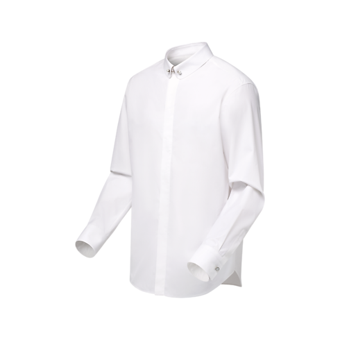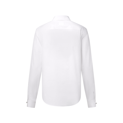 La camicia, realizzata in pregiato misto cotone e seta, è perfetta per completare i look da sera. L'esclusivo modello presenta abbottonatura nascosta ed elegante collo arrotondato, rifinito dalla chiusura con spilla. I polsini con bottoni effetto perla e il dettaglio iconico con firma "Marque L. Vuitton déposée" intessuta sul retro impreziosiscono la raffinata creazione.