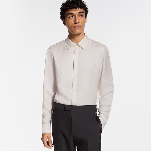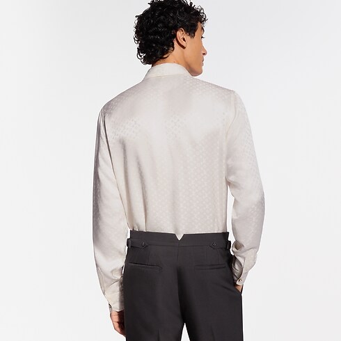 La camicia in seta color bianco è impreziosita dal motivo Mini Monogram in trama jacquard, le cui texture opache e lucide tono su tono esaltano la fluidità del tessuto e la sua naturale lucentezza. Questo capo versatile può essere abbinato a qualsiasi completo da sera oppure indossato da solo.