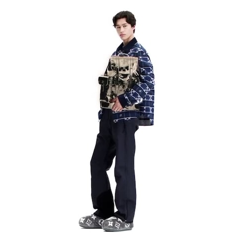 La camicia in morbida flanella di cotone è perfetta per le serate rilassanti davanti al fuoco. Il modello è impreziosito dal motivo a quadri in jacquard nei toni del blu navy, che incorpora elementi del decoro Damier. Il capo è rifinito dai polsini e dal colletto in velluto, quest'ultimo arricchito dalle iniziali LV ricamate, e dall'applicazione iconica in pelle color vacchetta naturale. La creazione, dall'allure grafica, può essere indossata anche come giacca a camicia.