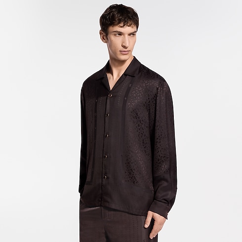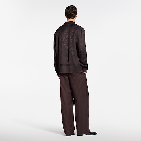 La camicia, in misto seta fluente riccamente decorato nei caldi toni del marrone, è impreziosita dal motivo LV Cheetah in trama jacquard caratteristico della collezione e da raffinati dettagli Monogram integrati nel design grafico di ispirazione felina, reso ancora più audace da un lucente gioco di texture. La silhouette morbida si presta all'abbinamento con i pantaloni coordinati per creare un abito da sera comodo e sofisticato.