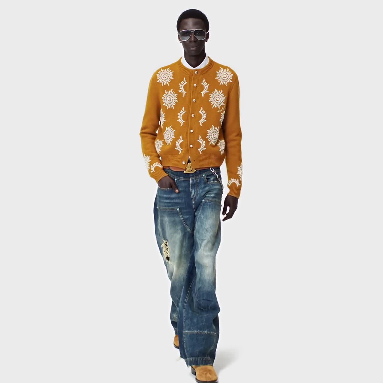 Il cardigan, proposta della sfilata Autunno-Inverno 2024, combina il savoir-faire della Maison e l'estetica Western della collezione. Il modello è realizzato in pregiata lana merino proveniente da allevamenti responsabili, impreziosita dal radioso motivo geometrico ricamato in perline e perle in resina. La firma Louis Vuitton e i bottoni effetto perlato aggiungono alla creazione un dettaglio sofisticato.