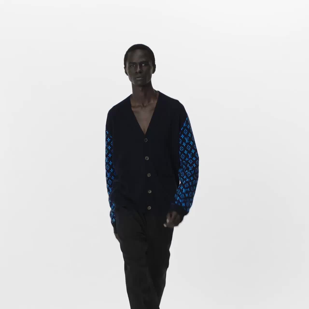 Il cardigan, con bottoni in corno, tasche applicate e spalle morbide, si distingue per lo stile casual e intramontabile. L'iconico motivo Monogram all-over color blu a contrasto, riprodotto in trama jacquard sulle maniche, aggiunge al modello un tocco grafico e contemporaneo. La creazione si abbina con eleganza a qualsiasi outfit.