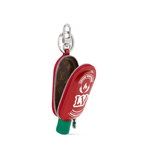 Il charm per borse LV Spicy rende omaggio alla cultura dello street food. L'accessorio riproduce una bottiglietta di salsa dalla tonalità vivace, impreziosita dalle iconiche firme Louis Vuitton, mentre l'interno è realizzato in tela Monogram. L'originale creazione, prodotta in Italia, può anche essere utilizzata come pochette, dotata di chiusura con zip, anello e moschettone argentati.