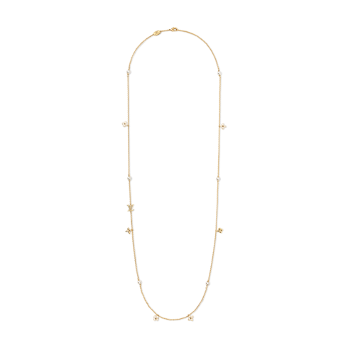 La collana lunga LV Floragram XS unisce l'iconico motivo Monogram alla raffinata bellezza e al simbolismo della perla. La sua delicata catenella, realizzata in metallo color oro, presenta una serie di emblematici fiori impreziositi da resina madreperlata, insieme alle iniziali LV e a luminose sfere, anch'esse in resina. Questo accessorio, di squisita eleganza, dona un tocco di sofisticata femminilità a qualsiasi outfit.