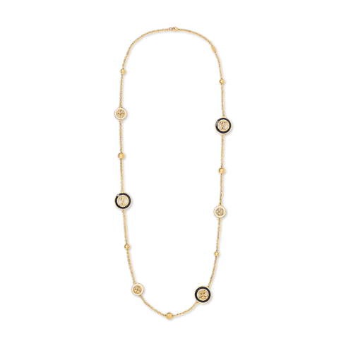 La collana LV Nautical propone uno straordinario connubio di eleganza femminile, dettagli ricercati e sofisticata maestria artigianale. La delicata catenella dorata è impreziosita dalle iconiche iniziali e dai fiori Monogram, incorniciati da anelli in lucente smalto. L'esclusivo sautoir è perfetto per aggiungere un ulteriore tocco di raffinatezza agli outfit ispirati al mondo marinaresco della collezione di abbigliamento di Louis Vuitton.