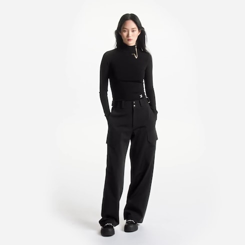 Il dolcevita, realizzato in morbida maglia elasticizzata, reinterpreta con un tocco inconfondibile un classico must-have. Il modello presenta su un lato una zip dorata con catenella che decora elegantemente il colletto, creando un originale effetto asimmetrico. Il capo dalla vestibilità attillata è completato dalle iconiche iniziali LV a contrasto.